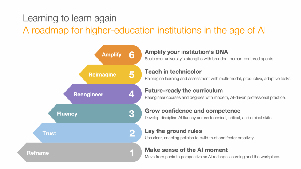 Here’s an outline of the AI roadmap for higher education that I presented. Each step represents real work already underway in leading institutions—not hypothetical futures, but emerging practices.